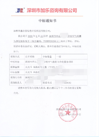 熱烈祝賀我司中標坪山新合實驗學(xué)校室內(nèi)空氣檢測志凈化服務(wù)項目。